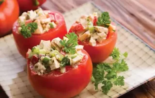 Ingredients 6 large tomatoes 2 cups cooked and cubed chicken ½ cup minced red bell pepper 1 celery rib, chopped 1 ½ tablespoons minced red onion 1/3 cucumber chopped ¼ cup plus 2 tablespoons olive oil 1 drop Lemon essential oil 1 drop Cilantro essential oil 1 tablespoon chopped fresh Italian parsley 1 tablespoon Dijon mustard 2 tablespoons of mayo or yogurt ranch dressing Directions 1. Cut ½ inch off top of each tomato. Scoop out pulp.